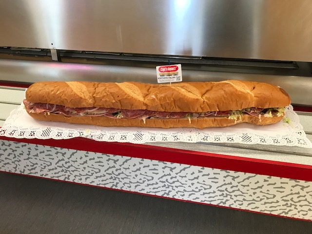 3 foot long elegantly displayed giant party sub by Captn Nemo’s for catering.